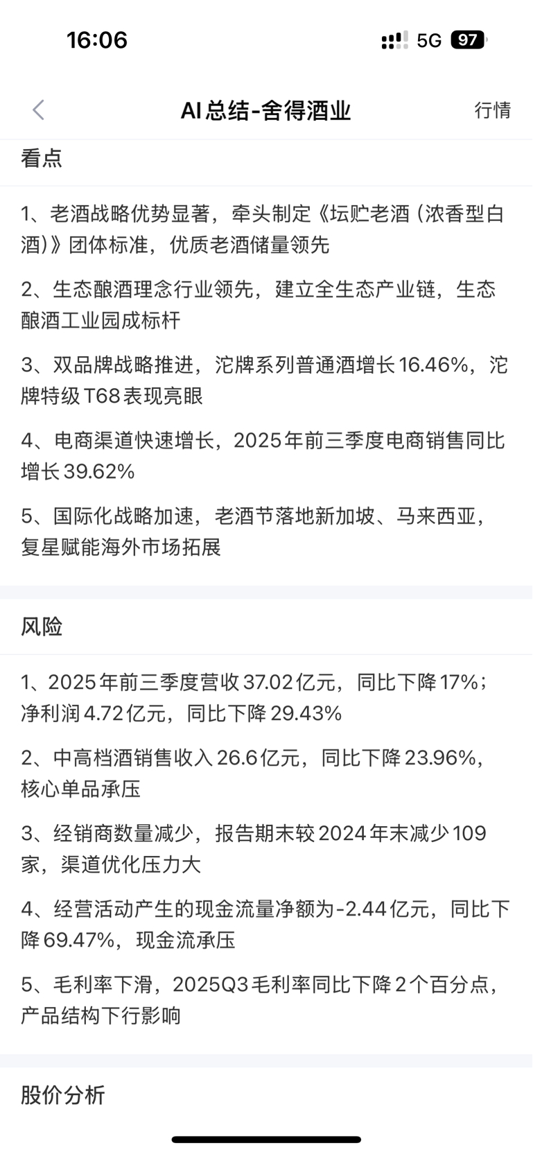 $舍得酒业(SH600702)$ AI 分析 2025 年舍得整体承压,营收及利润继续下滑,预测归母 3.9-5.5 亿,主要风险来自中高档产品销售及盈利下滑