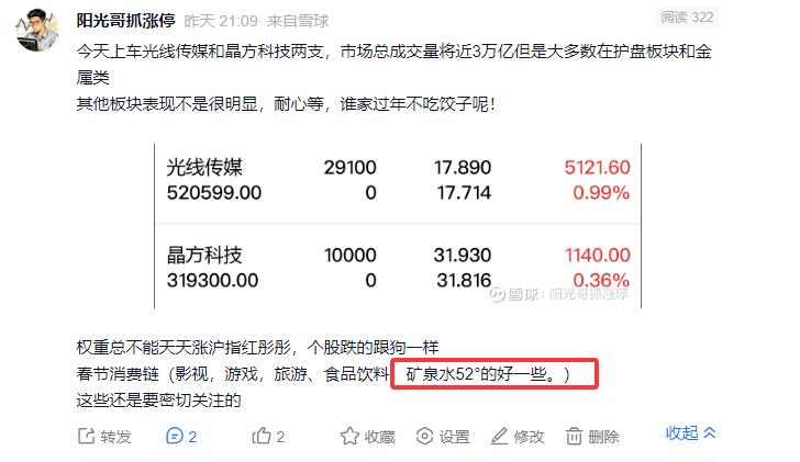 今天市场不怎么样午后昨天我们复盘的52度的矿泉水还不错直线拉升全线上板,毛子也就没差多少,关键茅台市值太大了。