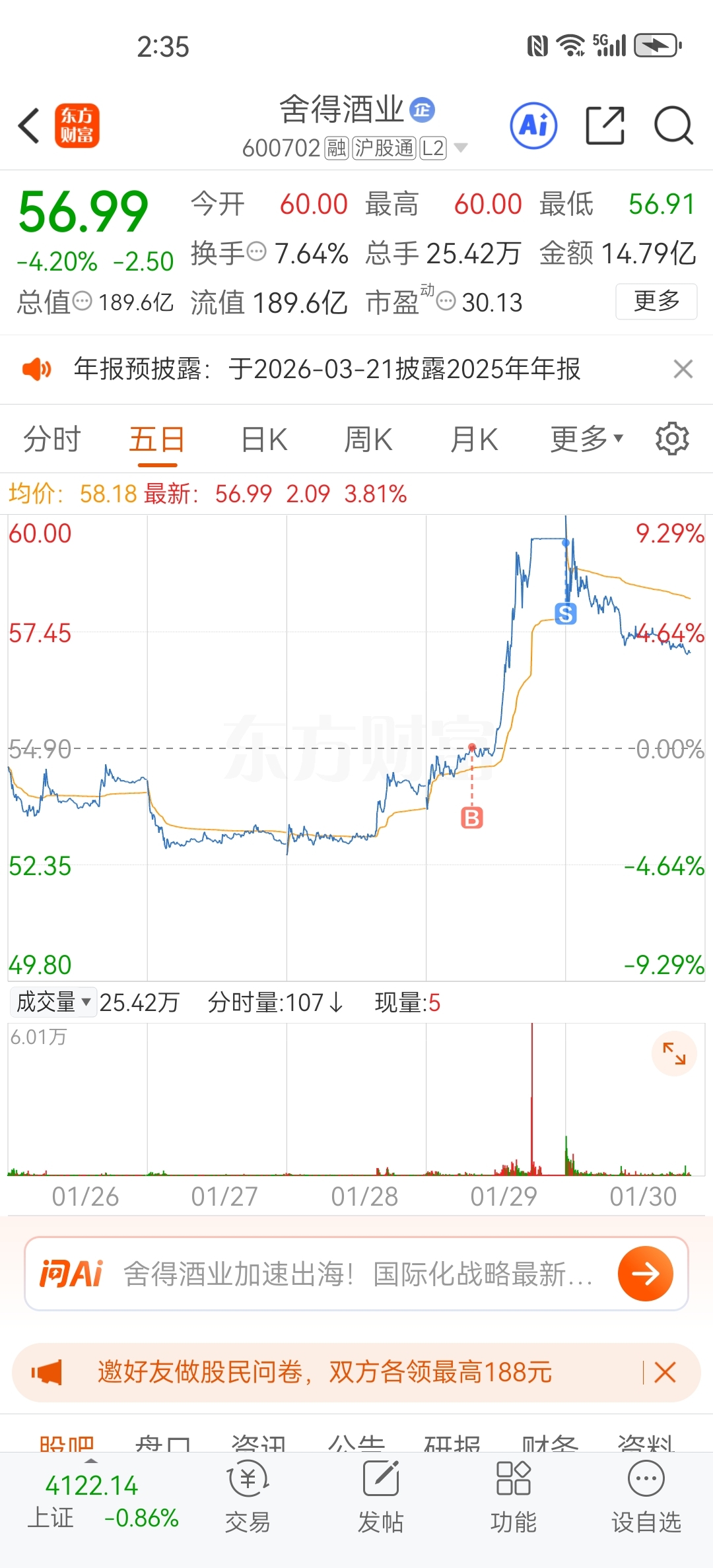 $舍得酒业(SH600702)$ 今年过年喝舍得,买5箱够了,谢谢主力