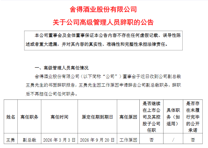 3月3日消息,舍得酒业发布公告称,公司董事会于近日收到副总裁王勇的书面辞职报告。因工作原因,王勇申请辞去舍得酒业副总裁职务,辞职后将不再担任该公司任何职务,王勇辞职自辞职报告送达董事会之日起生效。