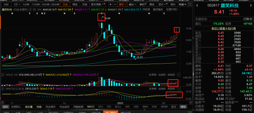 露笑科技:铜缆高速连接+半导体概念+新能源车+锂电池,光伏设备业务;都是当下的热门题材,而且在持续性上来说,都是持续性非常强的题材领域,尤其是半导体题材领域,虽然昨日处于调整之中,但是毕竟半导体前期已经持续放量,而且当下对于热点的关注更主要在持续性上,那么有半导体题材支撑,还有个股本来主要涉及光伏设备业务,光伏设备业务主要和电相关,电力电池领域也一直是市场关注的焦点,属于稳步发力之中,那么既然基本面良好,技术上昨日量能表现平稳,而且前期趋势上回调,虽然跌破60日均线,但是在120日均线支撑以后,继续放量向上,K线重新回到了60日均线位置上方,昨日拉涨,在9元位置附近,量价背离见顶,盘中先继续注意9元压力位突破,突破放量,注意前期上涨高点。