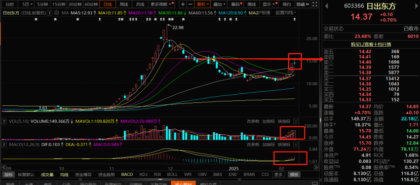 日出东方:昨日量能放量以后,但是股价在15元位置附近,收实体非常小的小阴线,已经有点背离见顶的迹象出现,不过因为换手率其实还在18%左右,其实和那些上涨厉害的个股相比,换手率并不是非常的高,不过前期的时候,强调过当下科技之中,不仅要关注生产研发,比如半导体,AI芯片等等,还要关注落实以后的销售,个股在全国家电,特别是太阳能产品销售中,持有三大品牌,还覆盖城乡销售和服务,所以基本面支撑之下,技术上今日主要注意60日均线上方,前期稍微聚量的15元关键位置压力位的突破,突破放量,上方通道打开,可以放心持有,要是没有突破15元位置,量能缩量,要回踩60日均线支撑,短线可以先落袋为安,等后期放量向上,继续操作。