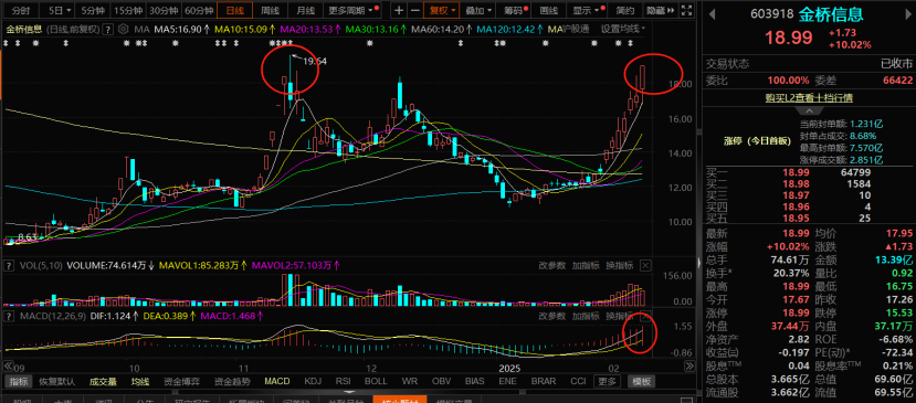 金桥信息:昨日踩着5日均线,10cm首次拉涨封板以后,收盘后高点已经靠近前期上升浪之中的19.5元位置附近,所以今日行情走势之中,主要还是先关注技术上,虽然60日均线还没有走出向上,其他中短期均线也没有一次排序支撑K线,但是因为这次主升浪是突破60日均线以后,踩着60日均线,持续放量向上,所以盘中继续注意量能的变化,主要是中短期行情走势中,前期高点19.5元位置附近压力位的突破,突破,继续放量,继续持有,要是没有突破前期高点,或者突破19.5元位置附近高点,没有守住,有触顶技术形态出现,就可以短线考虑落袋为安,后期等60日均线走出再说。