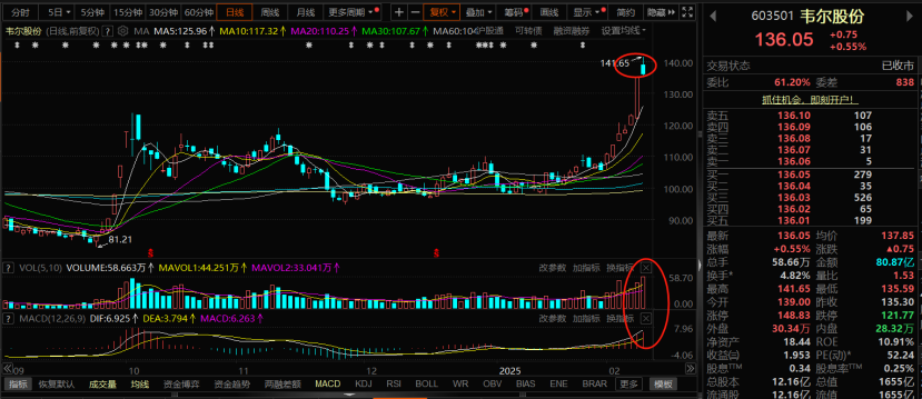 韦尔股份:昨日量能持续放量之下,股价高开低走,收小阴线,不过换手率在4.82%,换手率比较的低下,而且在周三的时候,已经出现了踩着5日均线,放量拉升涨停,所以今日盘中走势来说,主要先关注板块领域中,半导体板块的走势,半导体板块要是资金流入,走势向上,那么对于个股必然是支撑,而且个股和指数相关,还有和瑞芯微相比,多次说过,优势主要是在低位,所以盘中继续放量的话,短周期向上之中,主要关注昨日高点压力位的突破。