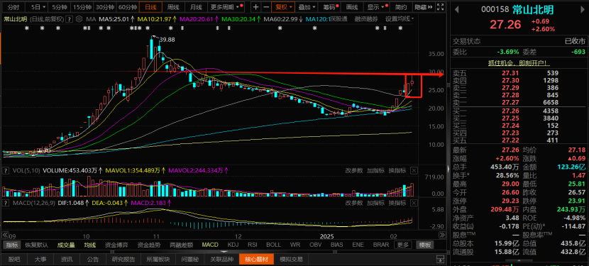 常山北明:昨日量能放量以后,但是收上影线较长的小阳线,并没有继续封板拉升,不过昨日因为有智谱AI题材的支撑,虽然上涨一般,但是和其他科技个股涨势相比,还算是比较坚挺的个股,盘中除了智谱AI题材支撑以外,另外不能忽略的就是大数据和数据中心这两个题材,主要是这两个题材都是和数据计算相关,都知道量子计算自从去年谷歌发展突破以后,数据计算领域也是科技发展的重心之一,而且上涨一直表现稳定,那么既然有这么多热点支撑,技术上就算当下其他均线在日线60日均线位置下方,而且昨天上涨,在前期近期回落的30元位置明显触顶,所以盘中先短线注意30元压力位的突破,突破放量,继续持有,要是在30元位置突破不出来,或者没有守住,短线可以先出来。