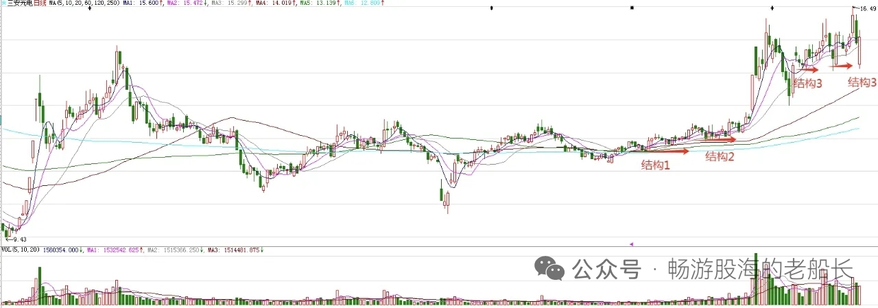 三安光电,今天大幅度低开之后高走,日K线实体比较大,上影线比较明显,这是好事儿。今天的低点,回踩了结构3和结构4的低点区域,基本符合预期,调整也基本到位了。。这是结构3和结构4突破后的回踩,是正常的调整。图中标注的前两个结构突破,意味着股价处在上涨趋势。结构3和结构4主要是为了蓄势突破前阵子高点而设计的。接下来,股价大概率会继续波段上涨。