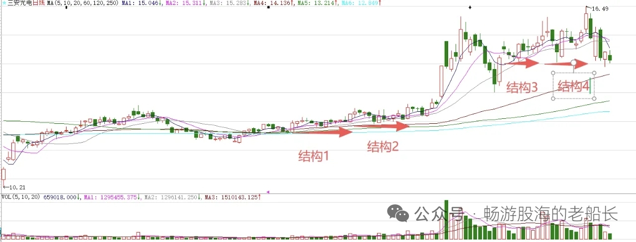 图中标注的前两个结构突破,意味着股价处在上涨趋势。结构3和结构4突破,意味着波段上涨不远了!!!!