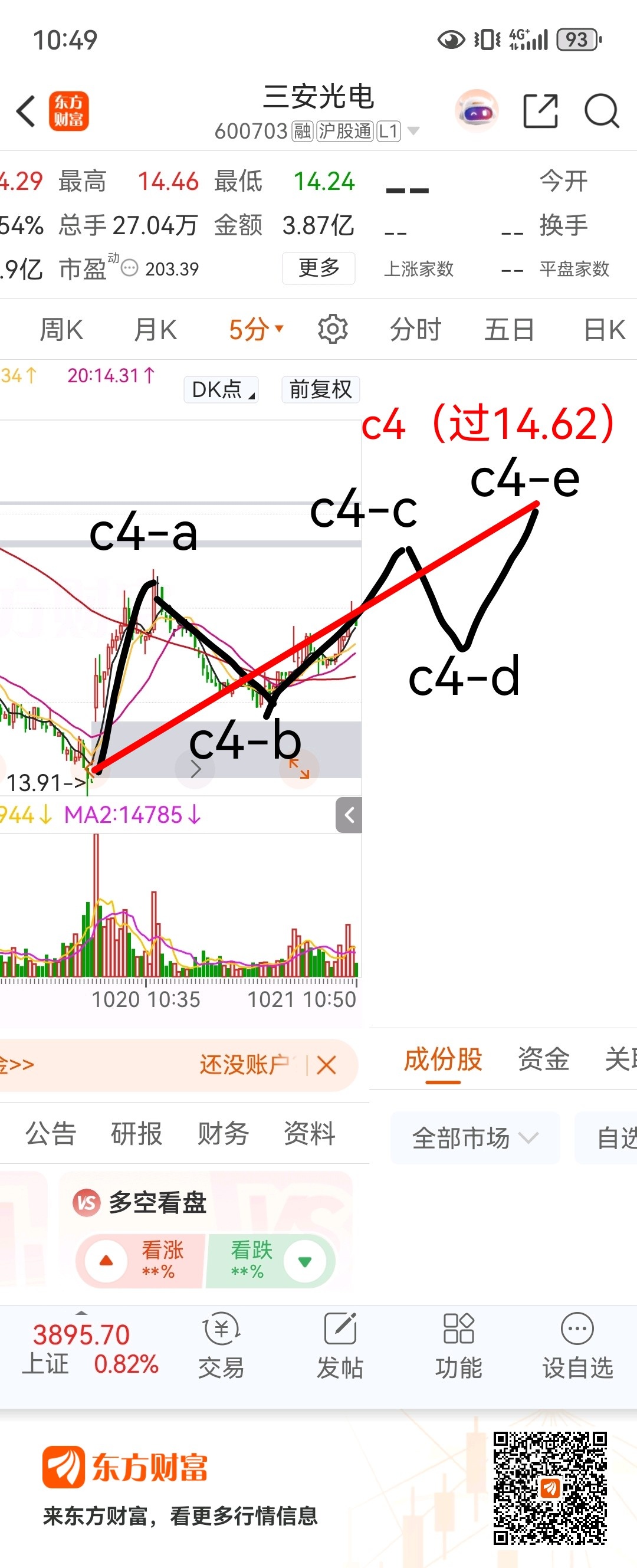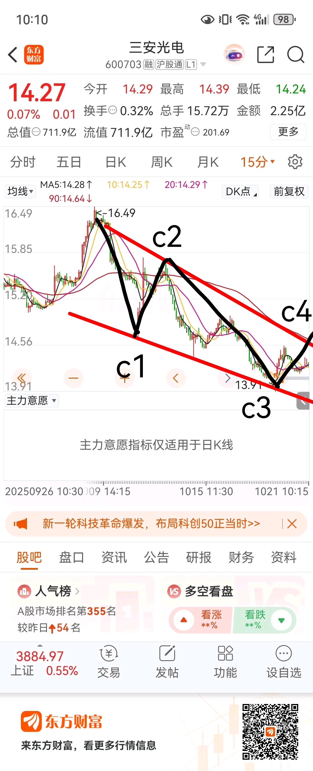 c1与c4重叠(c4过14.62),5浪结构(3-3-3-3-3),目前c4(向