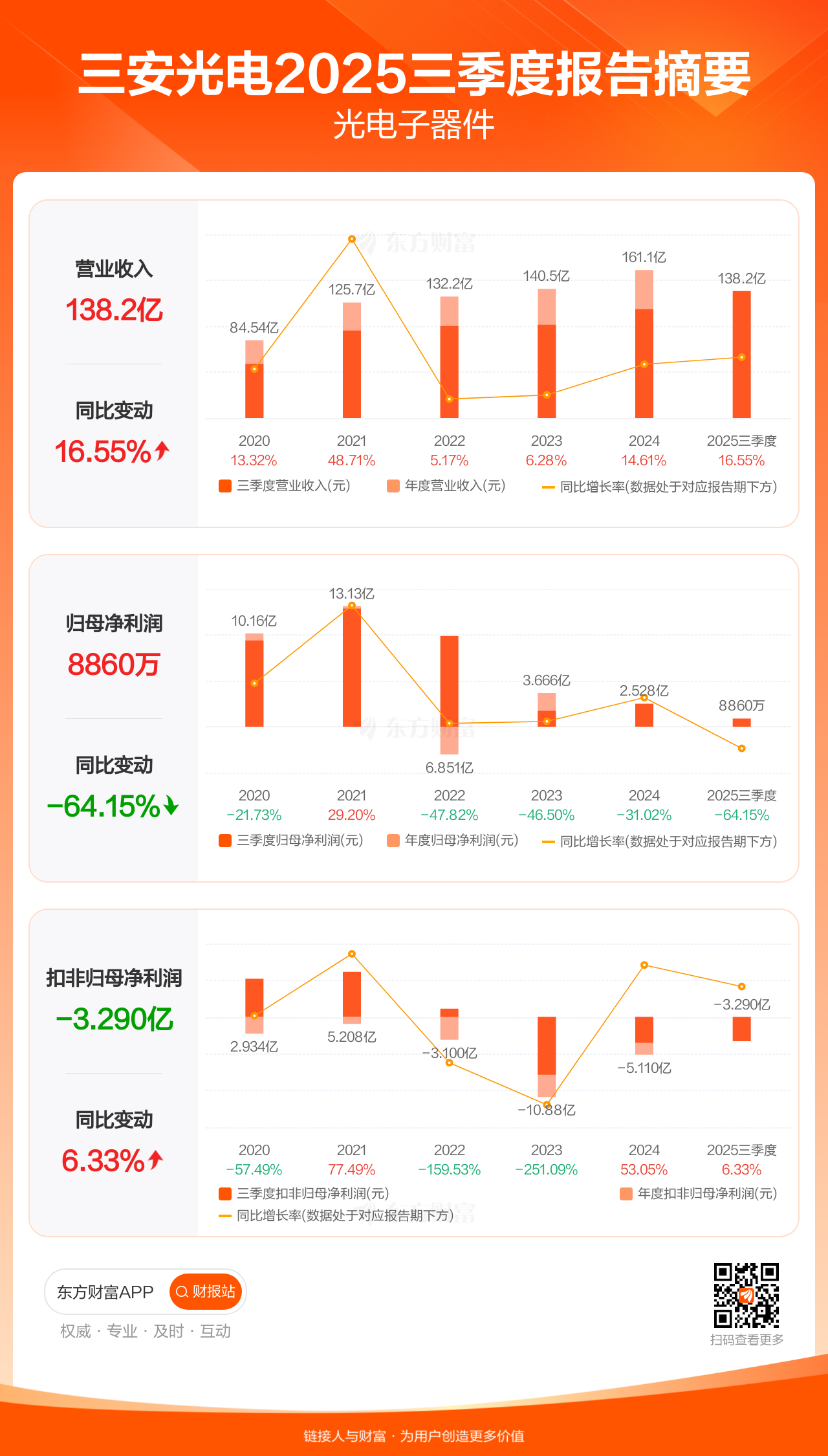 三安光电10月29日发布2025年三季报显示,公司前三季实现营业收入138.17亿元,同比增长16.55%;归母净利润8860.10万元,同比下滑64.15%;扣非归母净利润-3.29亿元。