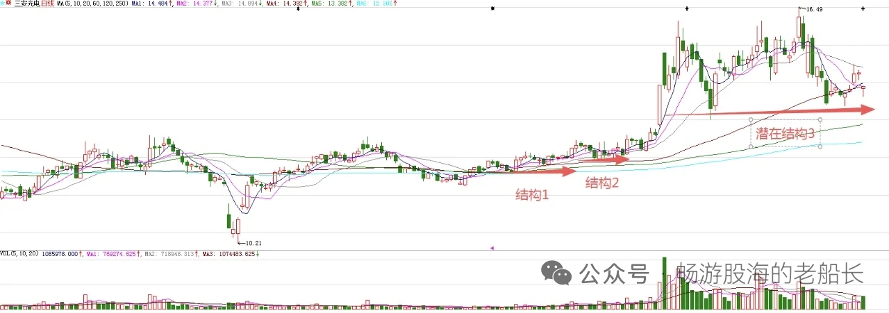 周期面来看,今天是第四个有效周期,明天是变盘节点。图中标注的两个结构突破,意味着股价处在上涨趋势。近期反复震荡,是在构筑潜在结构3,这是典型特点。