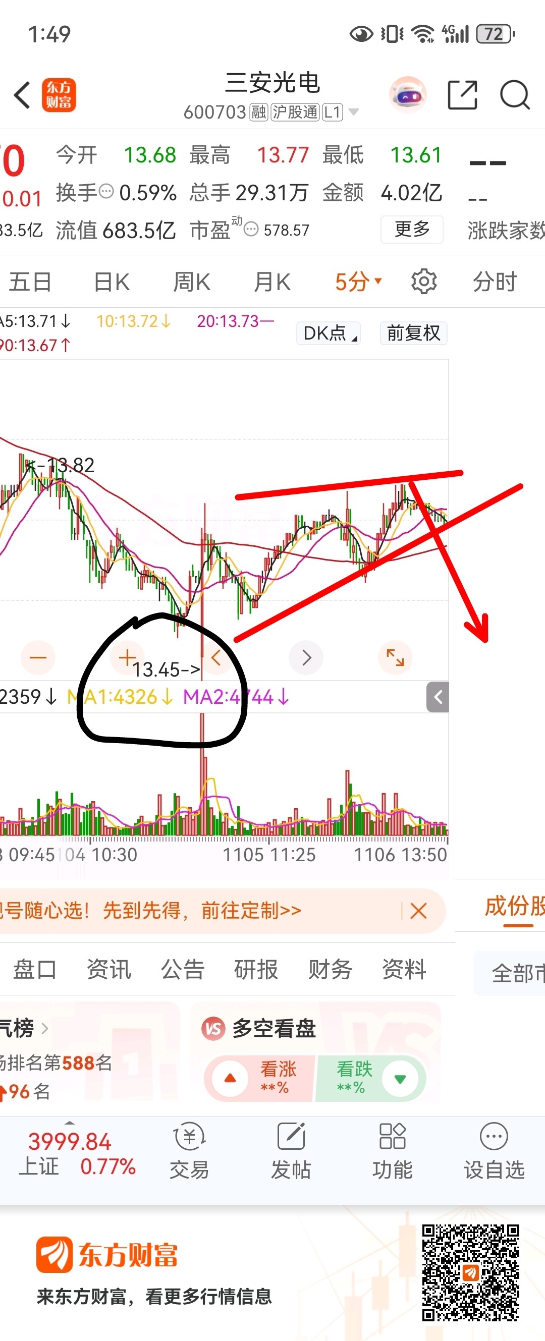 又是一个要挖坑的姿势,13.45如果不触及就是衰竭小结构出现,如果再次跌破,那么,会直接去考验突破性缺口(13.29~13.33)