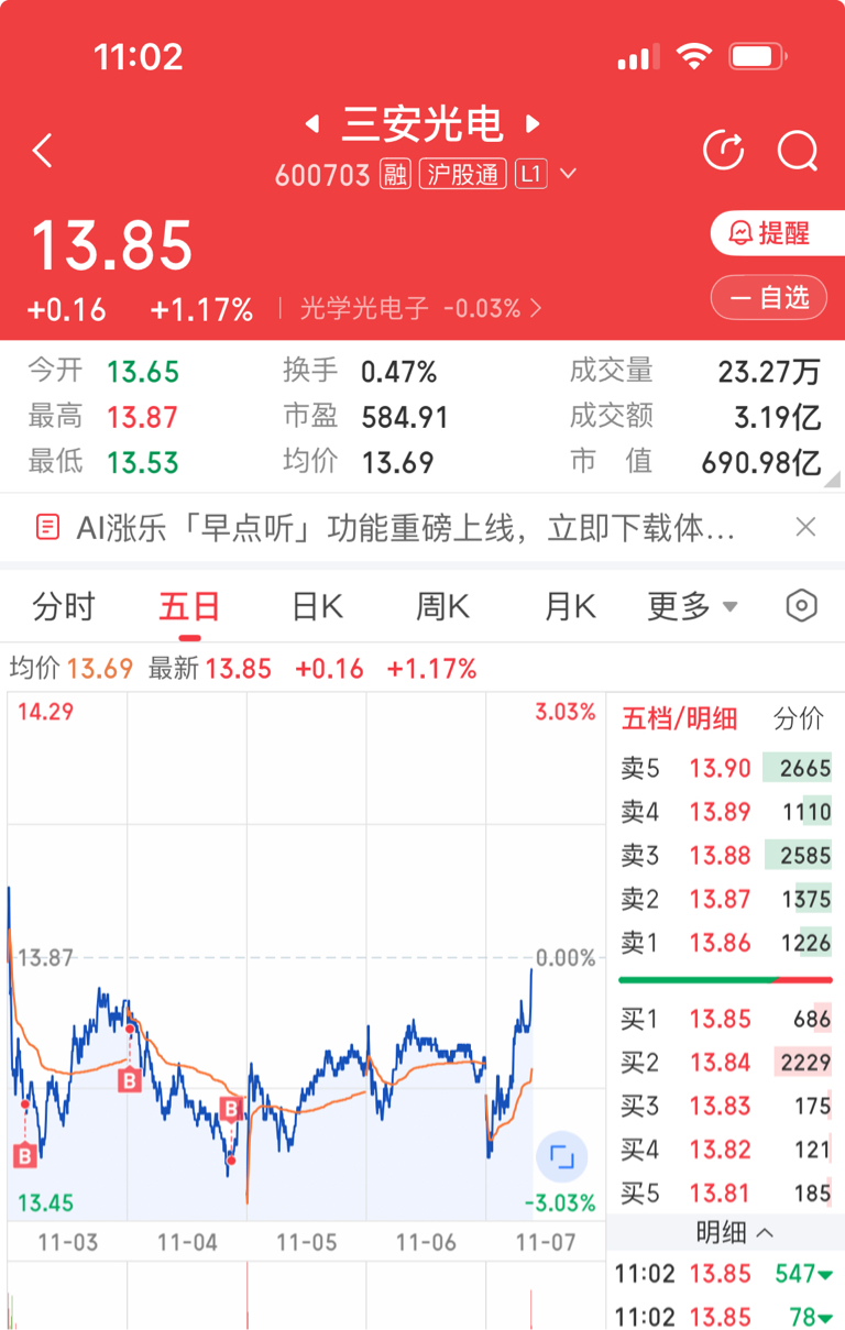 $三安光电(SH600703)$ 怎么回事,突然拉升,难道是 感觉对不起我吗?