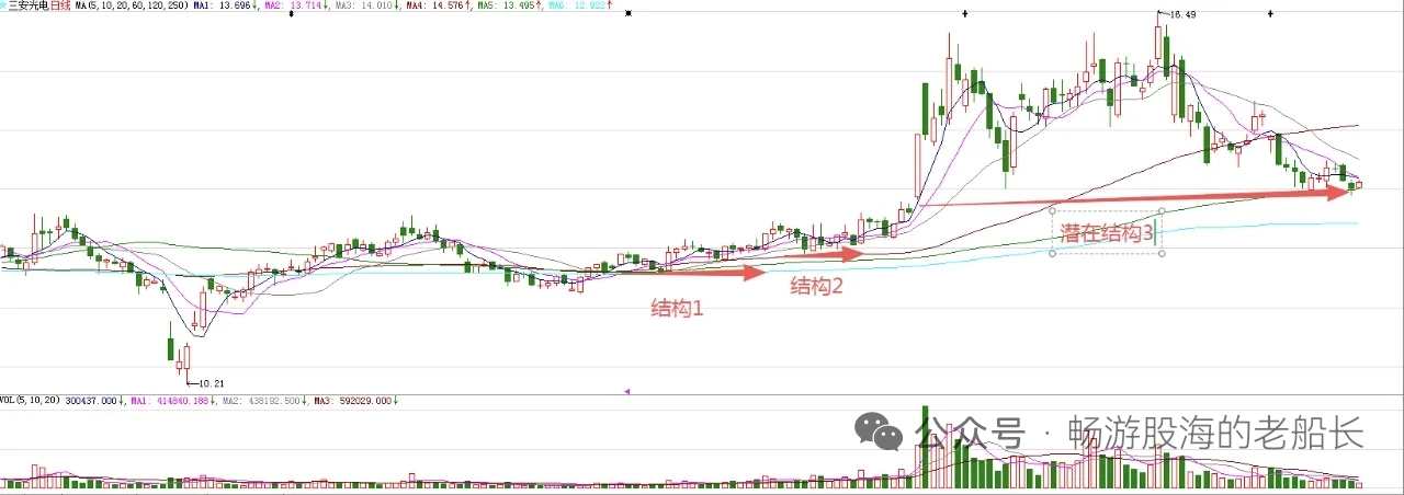 符合预期。收盘来看,今天再度走出了企稳信号。周月线都到了变盘节点,股价也到了半年线附近,所以,这里大概率是中期低点。图中标注的区域,大概率构筑潜在的结构3.图中标注的前两个结构突破,意味着股价处在上涨趋势。结构3是底部形态突破后的回踩,典型特征就是宽幅震荡。目前的震荡幅度,都是再正常不过的。