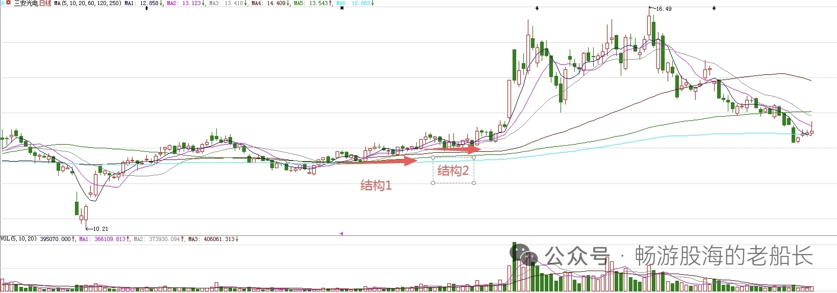 $三安光电(SH600703)$ 冲高回落,日K线上影线比较长,短线来看,周五股价大概率还有调整。接下来的调整,大概率还是围绕年线进行。正常情况下,年线附近,是中期调整结束的位置。图中标注的结构1和结构2突破,意味着股价处在上涨趋势。此后至今的调整,是底部形态突破后的洗盘,宽幅震荡是主旋律。