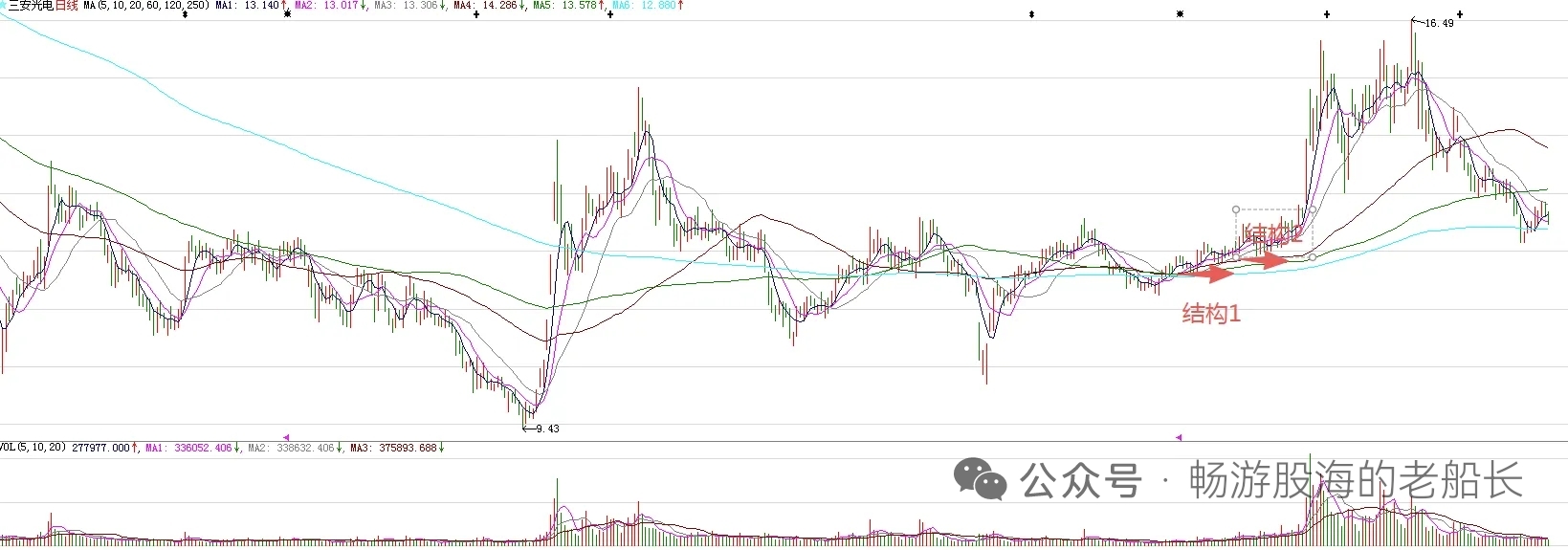 日线级别的走势来看,今天探底回升,碰到了年线支撑。在昨天的分析中,本人的观点是接下来一段时间,股价大概率围绕年线上下震荡,整体震荡幅度不大,在这里构筑阶段性底部形态。现在,依然是这个观点。图中标注的结构1和结构2突破,意味着股价处在上涨趋势。此后至今的调整,是中期底部形态实现有效突破后的洗盘,宽幅震荡是常态。