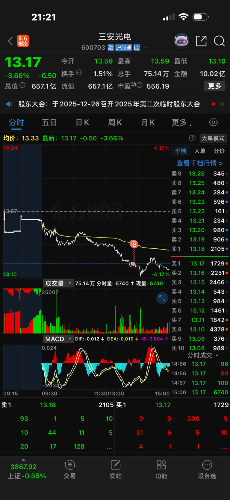 $三安光电(SH600703)$ 一买就跌,明天能涨几分钱让我解套出来吗?