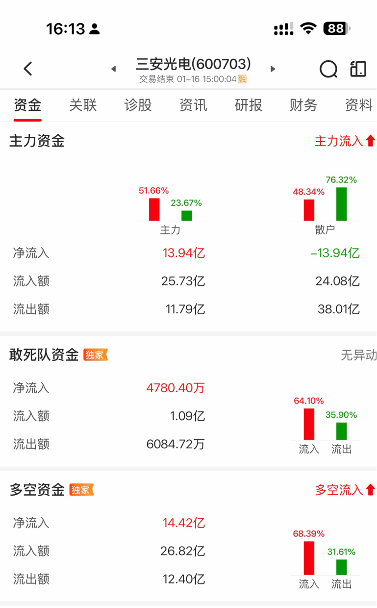 $三安光电(SH600703)$ 盘后交易数据:机构席位资金:净流入13.94亿;敢死队游资只抢入:4780万;多空资金净流入:14.42亿元。其中散户净流出:13.94亿。