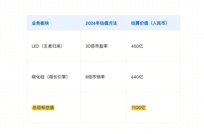 给子三安1100亿估值,传统LED450亿、碳化硅640亿。目前股价15-16元