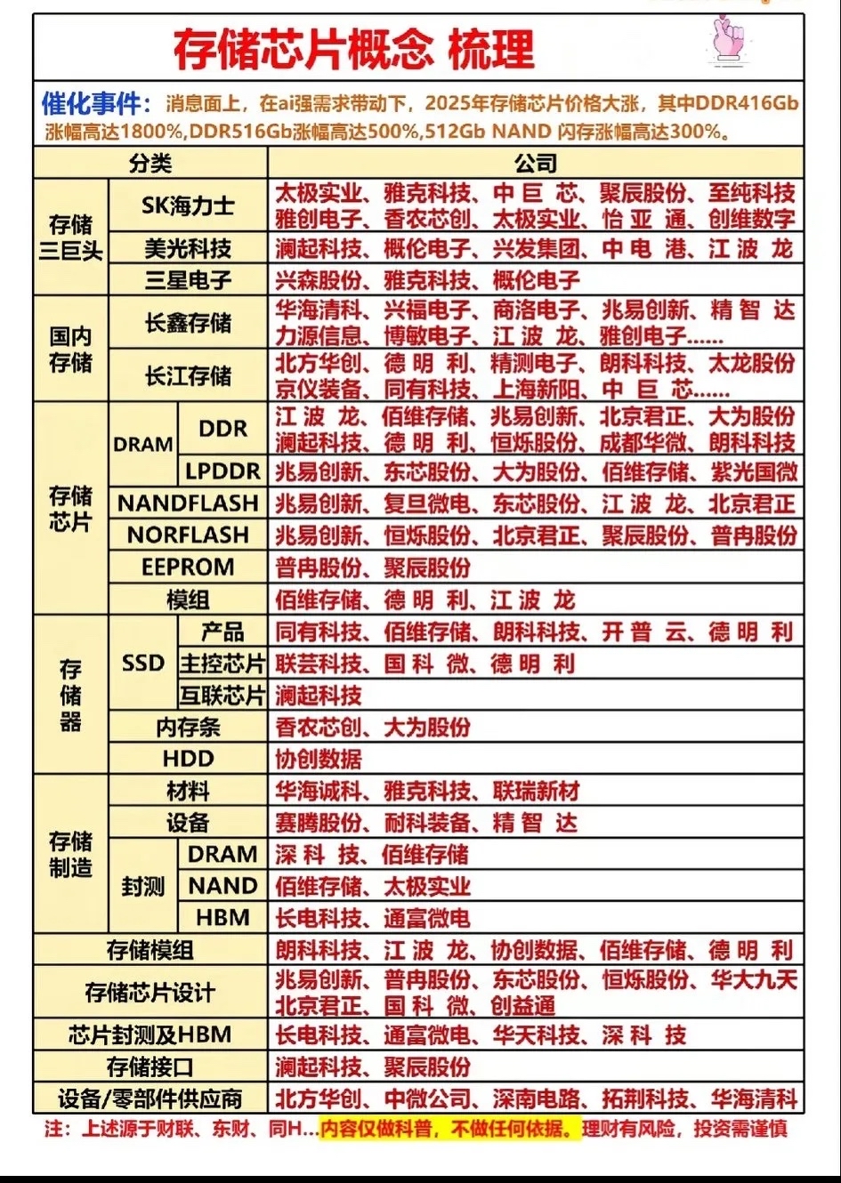 * 设备与零部件:精智达(测试设备)、北方华创/拓荆科技(薄膜沉积等前道设备)。无论哪种存储芯片扩产,都必须购买设备,需求最稳定。
