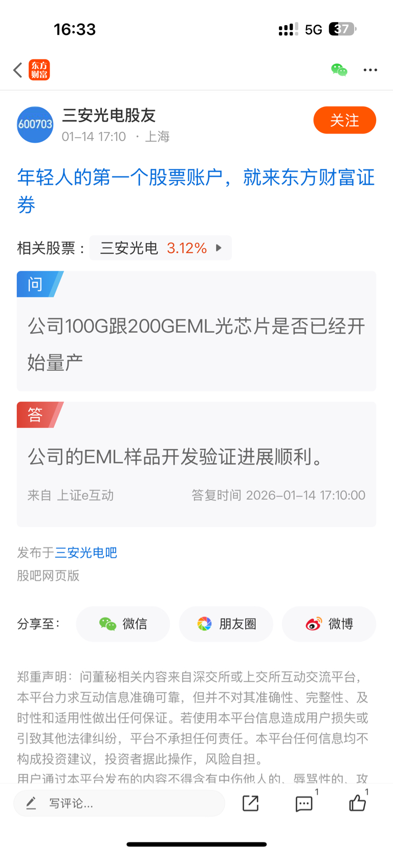温馨提示: 1.根据《证券法》规定,禁止编造、传播虚假信息或者误导性信息,扰乱证券市场;2.用户在本社区发表的所有资料、言论等仅代表个人观点,与本网站立场无关,不对您构成任何投资建议。用户应基于自己的独立判断,自行决定证券投资并承担相应风险。《东方财富社区管理规定》