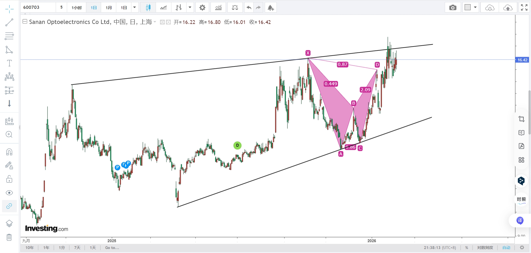 日线的下跌蝙蝠形态,D点16附近为反转点,形态完成后进入回调阶段,回调至14.15后止跌向上拉升,突破原反转点D点,目前在通道上轨附近进入持续整理形态,一旦向上突破,趋势形成。整理的差不多了,安子加油吧。