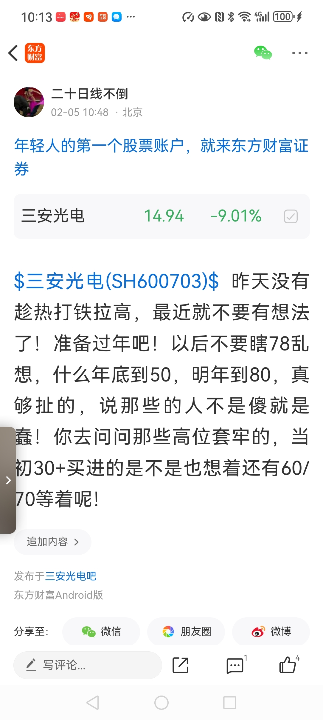 温馨提示: 1.根据《证券法》规定,禁止编造、传播虚假信息或者误导性信息,扰乱证券市场;2.用户在本社区发表的所有资料、言论等仅代表个人观点,与本网站立场无关,不对您构成任何投资建议。用户应基于自己的独立判断,自行决定证券投资并承担相应风险。《东方财富社区管理规定》