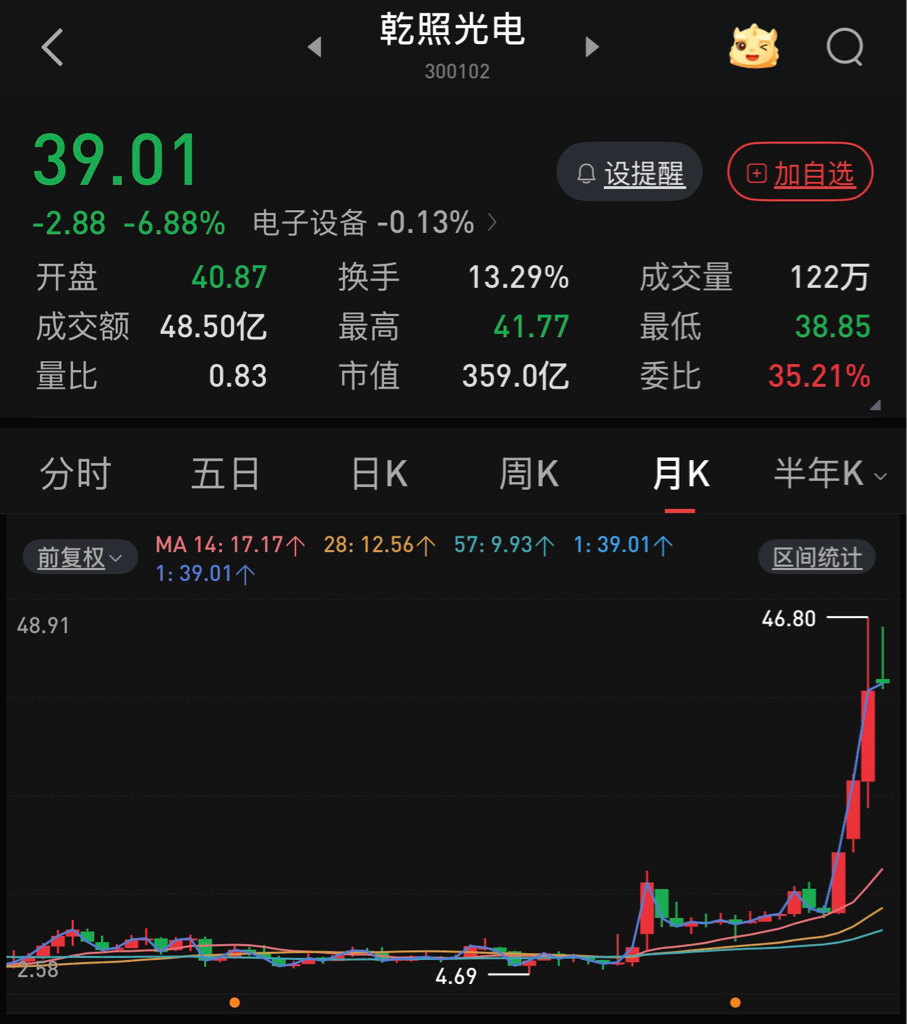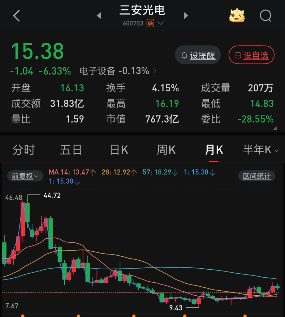 $三安光电(SH600703)$ 三安光电只要涨上几个点,整个吧里都是利好!一片歌舞升平。只要跌上几个点,又是一番黑暗的景象。同志哥:理性一点好吧?静下心来,翻一翻周K线和月K线的位置;大盘上涨到4000点,它还不是在地板上趴着呢?说他出货,请问怎么出?你要说乾照光电出货,我倒是愿意相信,去年毕竟涨了400%了吧?两股没有可比性。在这里,我不推荐股票。只是想说的是:相信自己,不要相信别人的蛊惑。