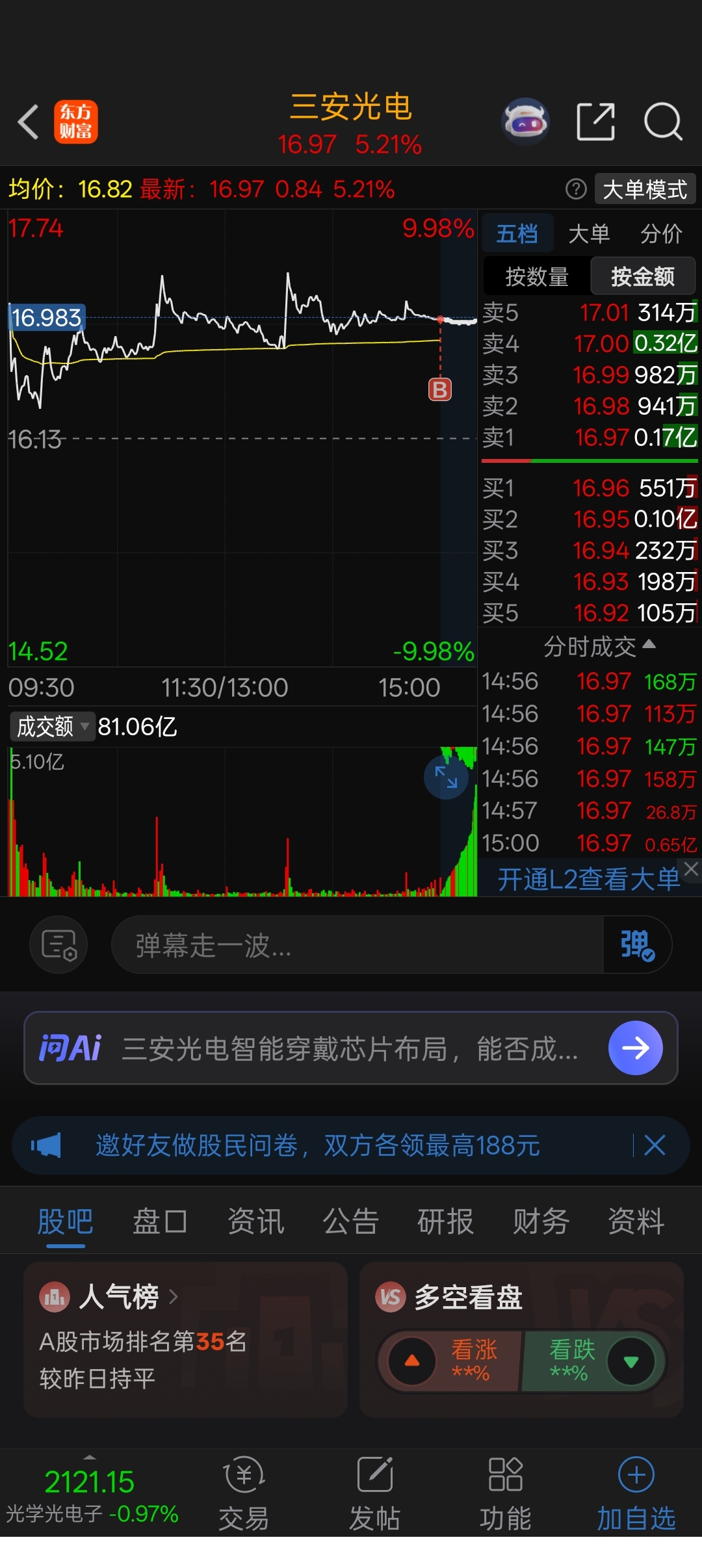 温馨提示: 1.根据《证券法》规定,禁止编造、传播虚假信息或者误导性信息,扰乱证券市场;2.用户在本社区发表的所有资料、言论等仅代表个人观点,与本网站立场无关,不对您构成任何投资建议。用户应基于自己的独立判断,自行决定证券投资并承担相应风险。《东方财富社区管理规定》