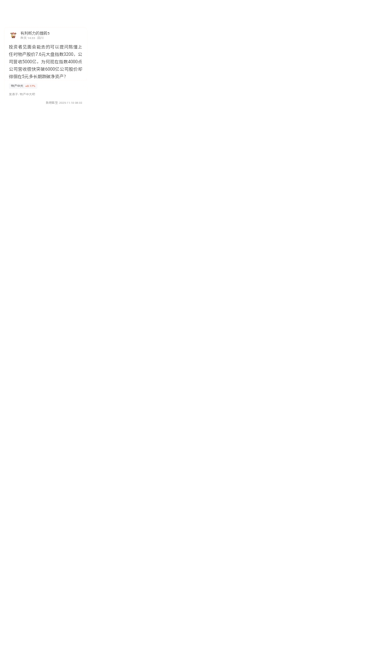 投资者见面会能去的可以提问陈懂上任时物产股价7.6元大盘指数3200,公司营收5000亿,为何现在指数4000点公司营收很快突破6000亿公司股价却徘徊在5元多长期跌破净资产?