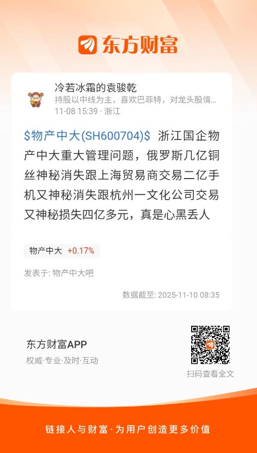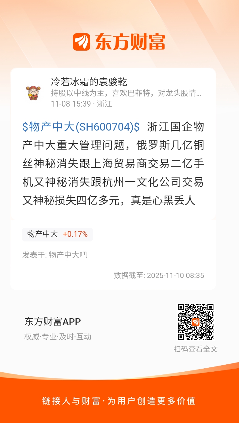 $物产中大(SH600704)$ 浙江国企物产中大重大管理问题,俄罗斯几亿铜丝神秘消失跟上海贸易商交易二亿手机又神秘消失跟杭州一文化公司交易又神秘损失四亿多元,真是心黑丢人