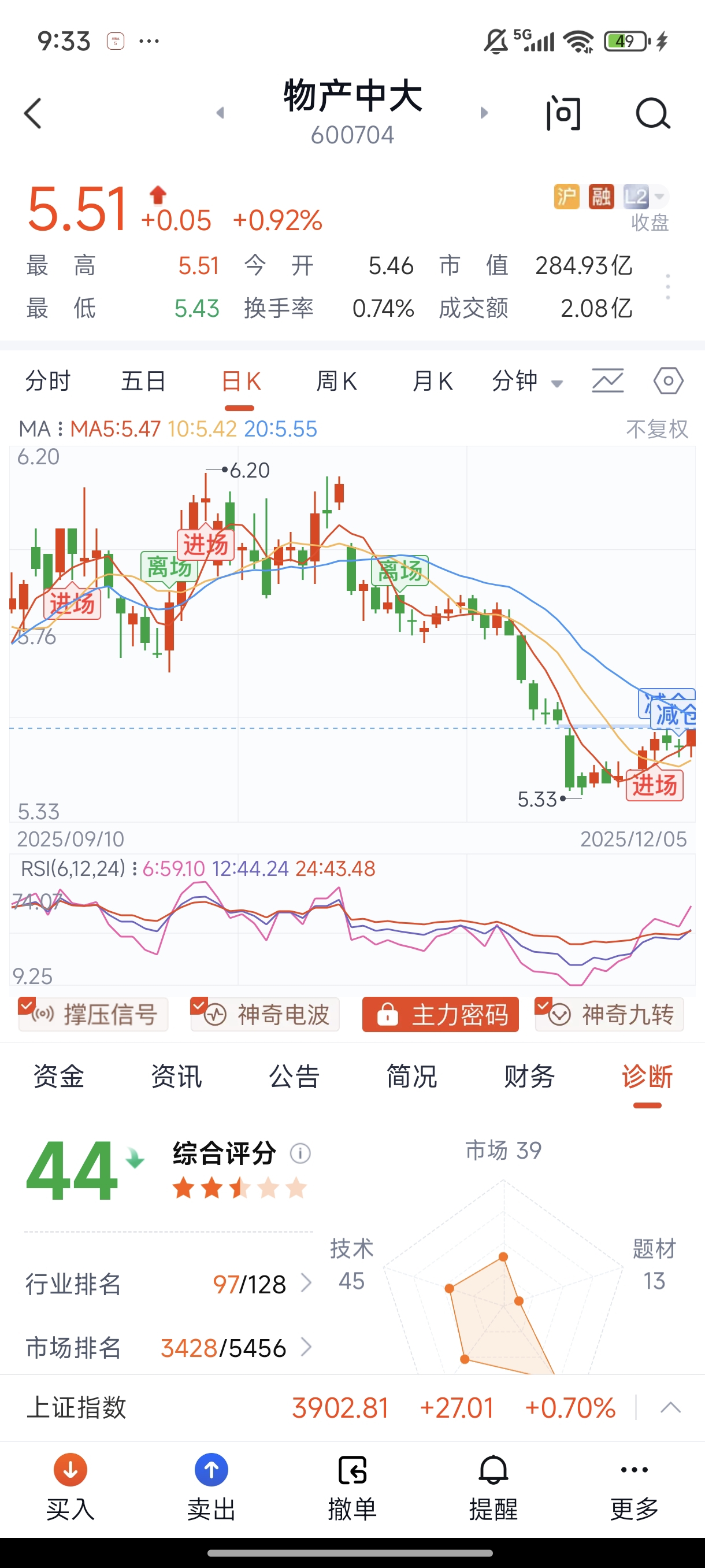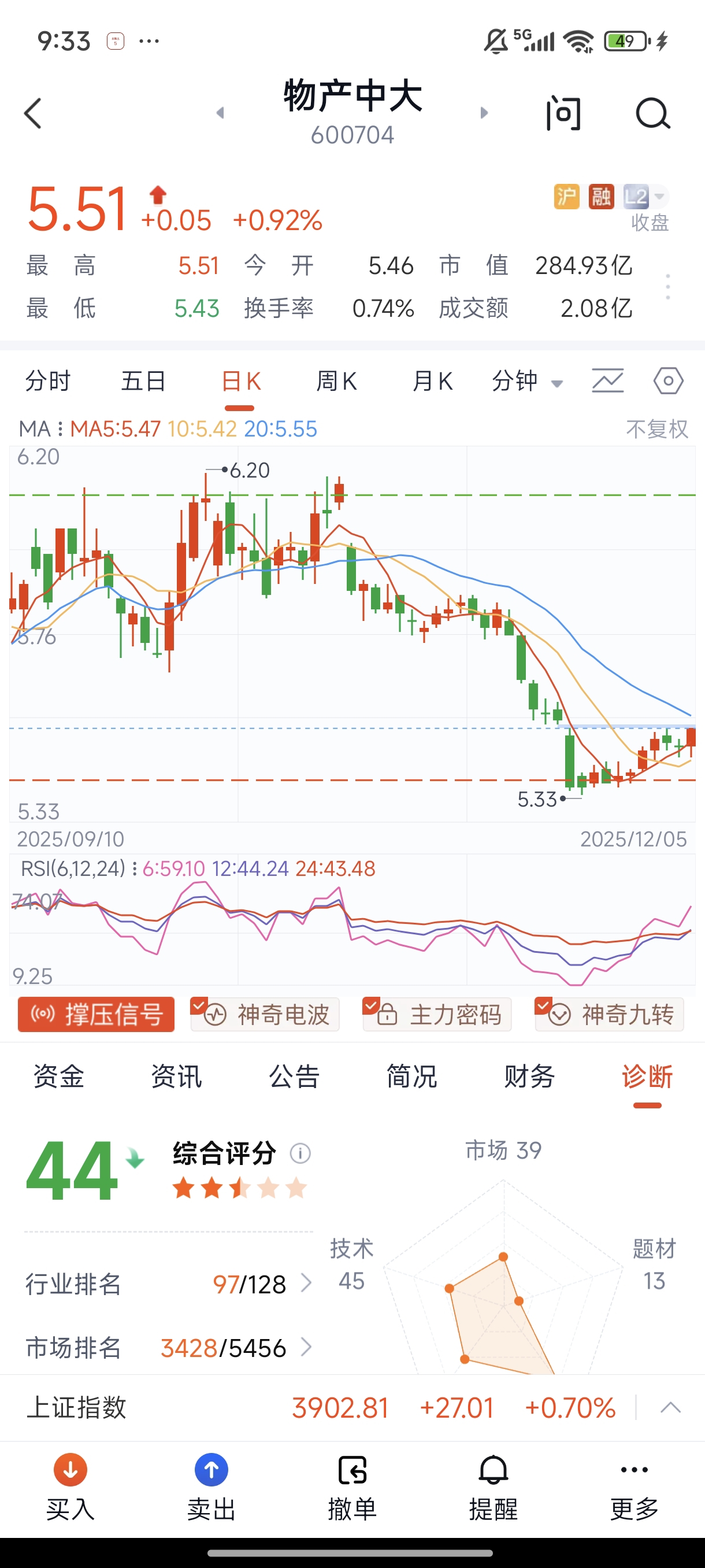 $物产中大(SH600704)$ 如图所示,雾大,日线级别的反弹已经在准备就绪,支撑线上介入,短线没有毛病,从中金岭南出来的50000股资金在找下家,入眼的,依旧是厦门国贸和物产中大,雾大的调整空间其实已经到位了,可以搏反弹,但短线介入仓位不宜过多,终究跌破20周线,需要时间修复。目前主力自己入场后,有减仓动作,乘洗盘可以抓短线买点。