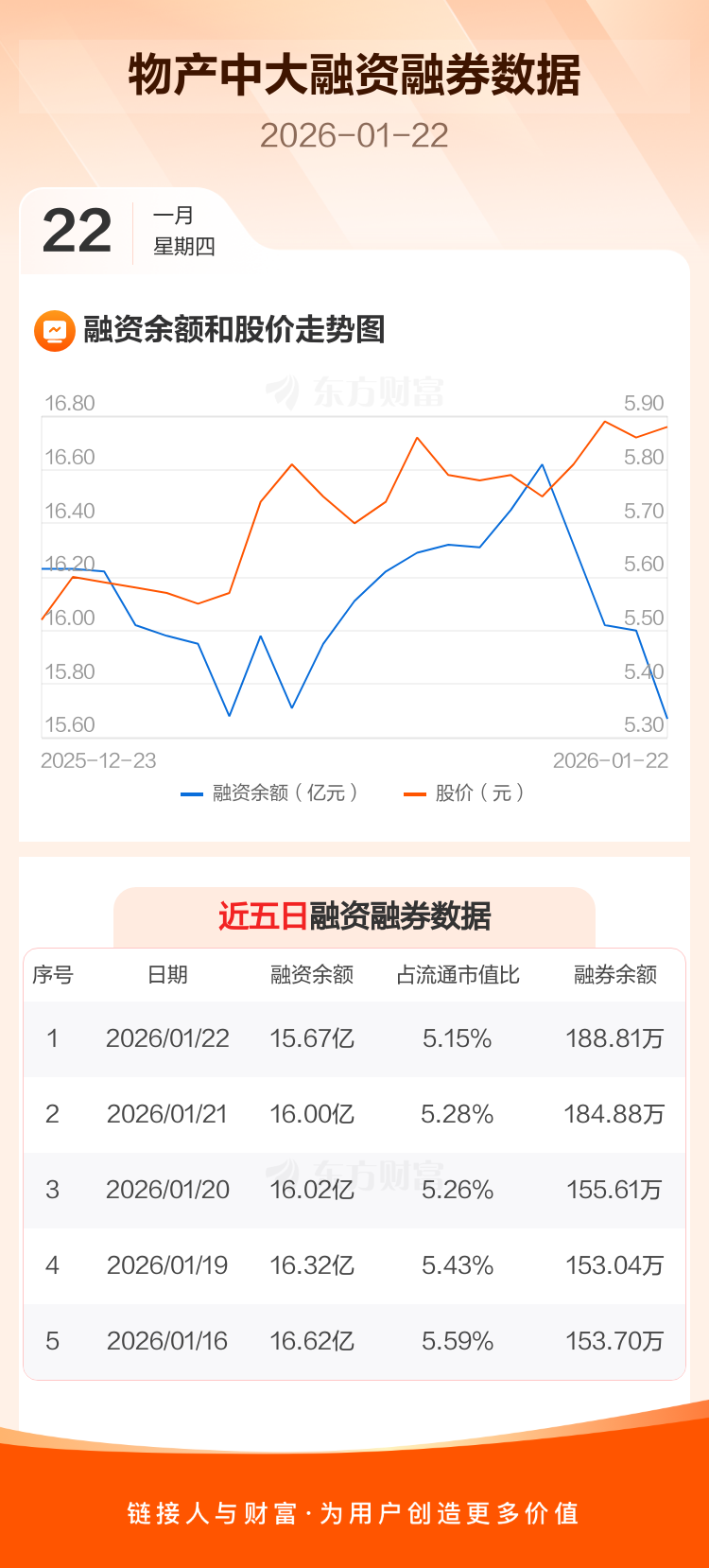 交易所最新数据显示,物产中大于2026年1月22日获融资买入4654.67万元,融资偿还8004.25万元,当日融资净偿还3349.58万元。目前,该股融资余额15.67亿,占流通市值比例为5.15%。
