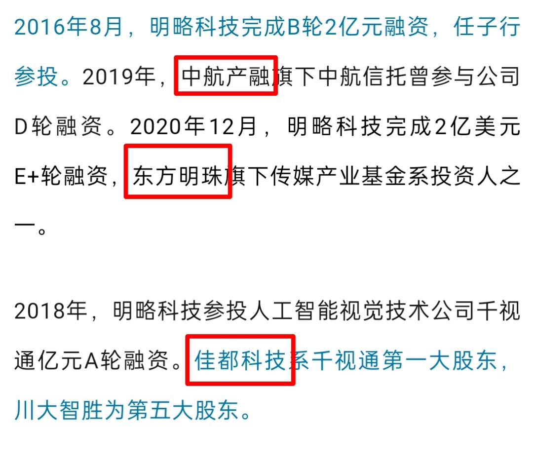 $中航产融(SH600705)$ 2019年,中航产融旗下中航信托曾参与公司D轮融资。2020年12月,明略科技完成2亿美元E+轮融资,东方明珠旗下传媒产业基金系投资人之一。2018年,明略科技参投人工智能视觉技术公司千视通亿元A轮融资。佳都科技系千视通第一大股东