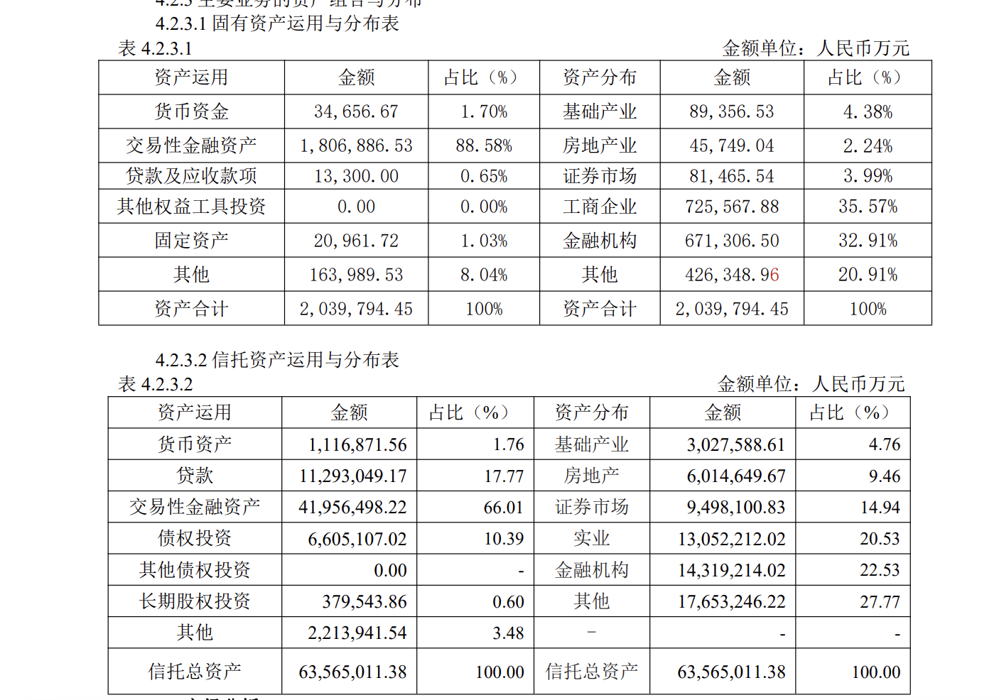根据中航信托2023年年报,截至2023年年末,其固有资产合计203.98亿元,其中投向交易性金融资产180.69亿元,占比88.58%;信托资产合计6356.50亿元,其中投向交易性金融资产4195.65亿元,占比66.01%。