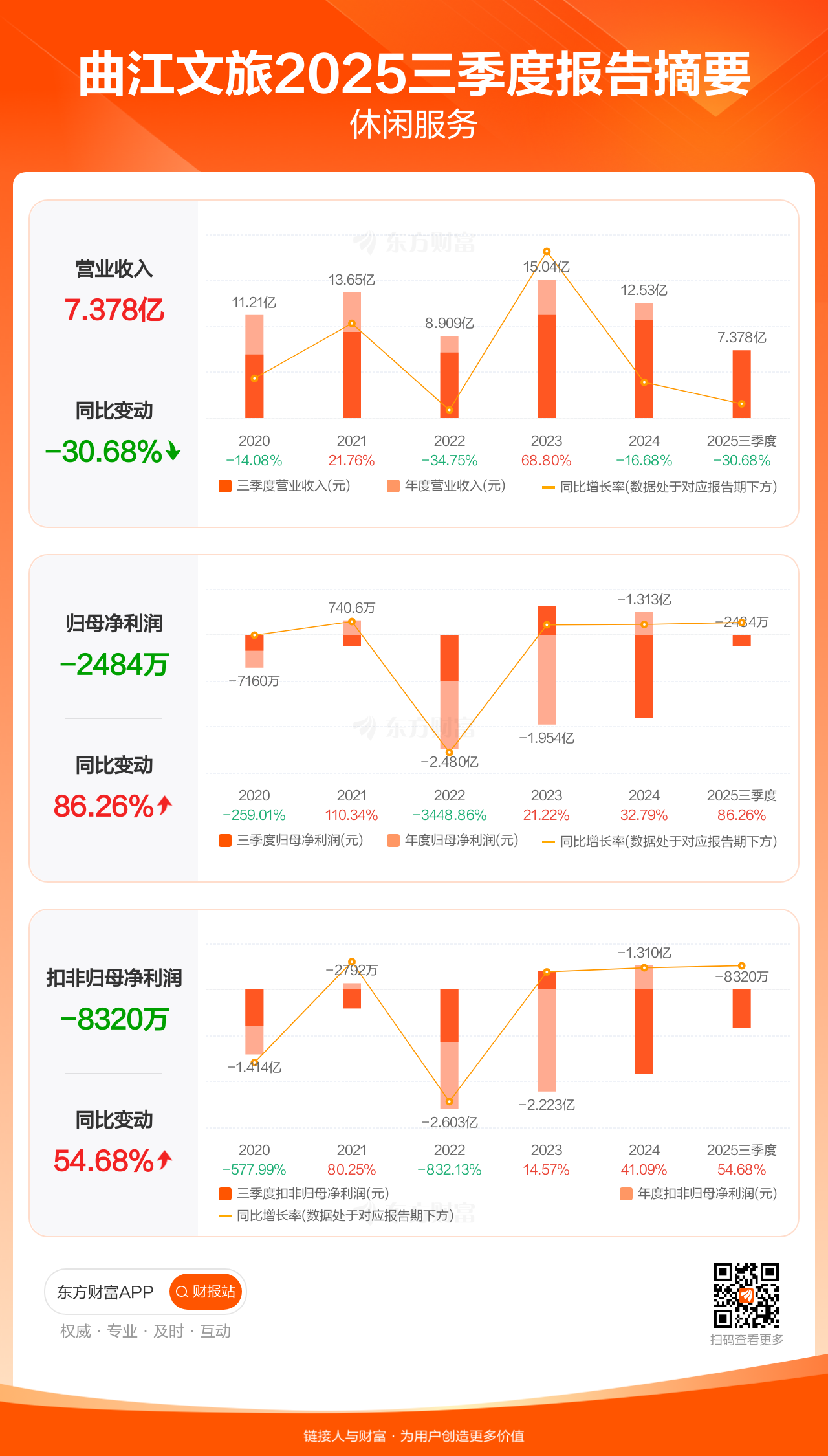 曲江文旅10月29日发布2025年三季报显示,公司前三季实现营业收入7.38亿元,同比下滑30.68%;归母净利润-2484.01万元;扣非归母净利润-8320.29万元。