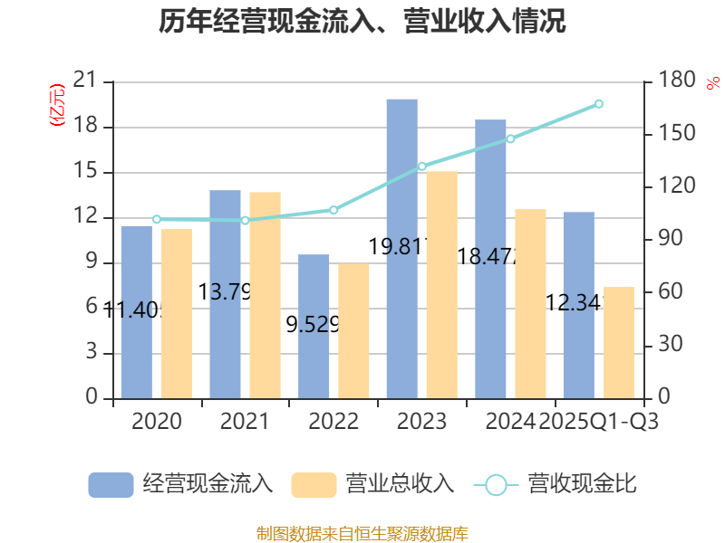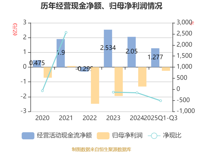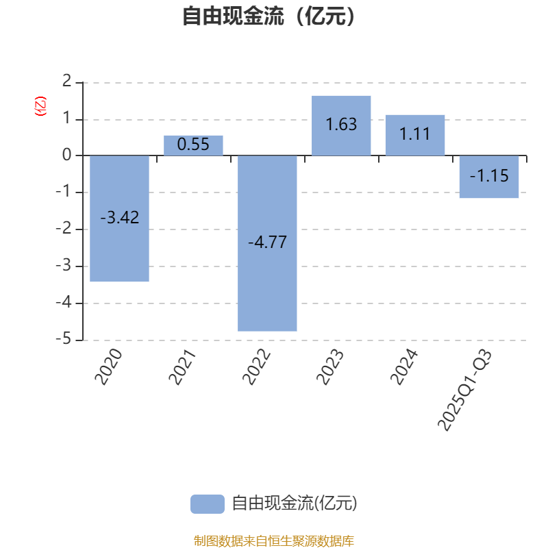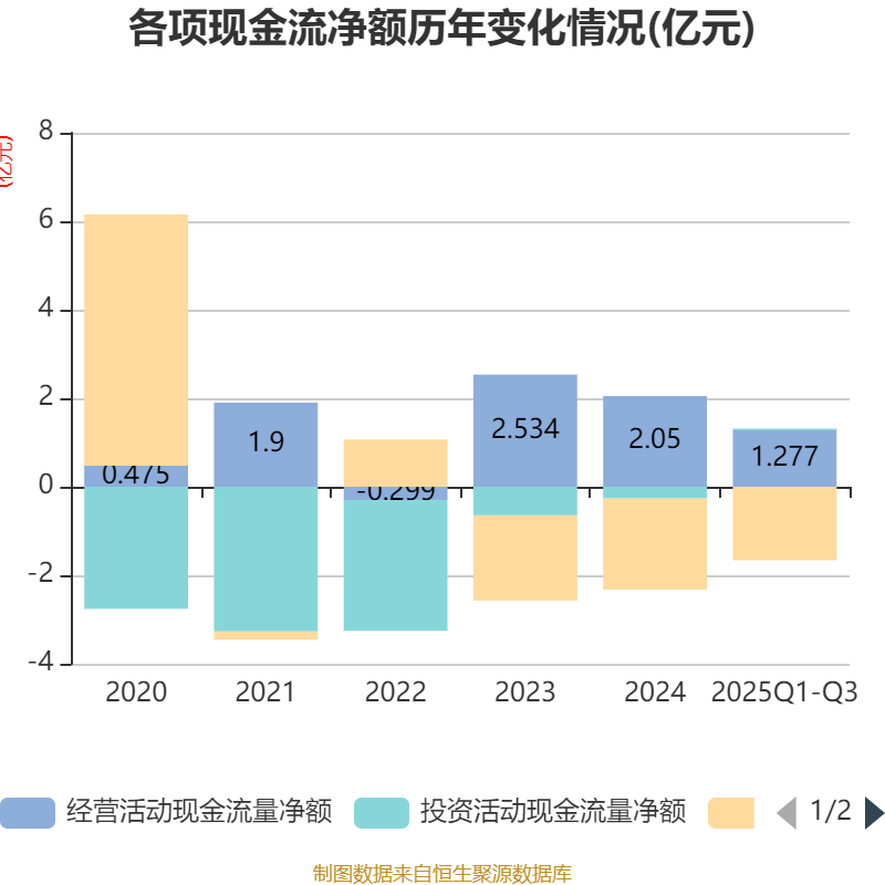2025年前三季度,公司经营活动现金流净额为1.28亿元,同比下降10.72%;筹资活动现金流净额-1.66亿元,同比减少781.22万元;投资活动现金流净额361.17万元,上年同期为-3148.47万元。