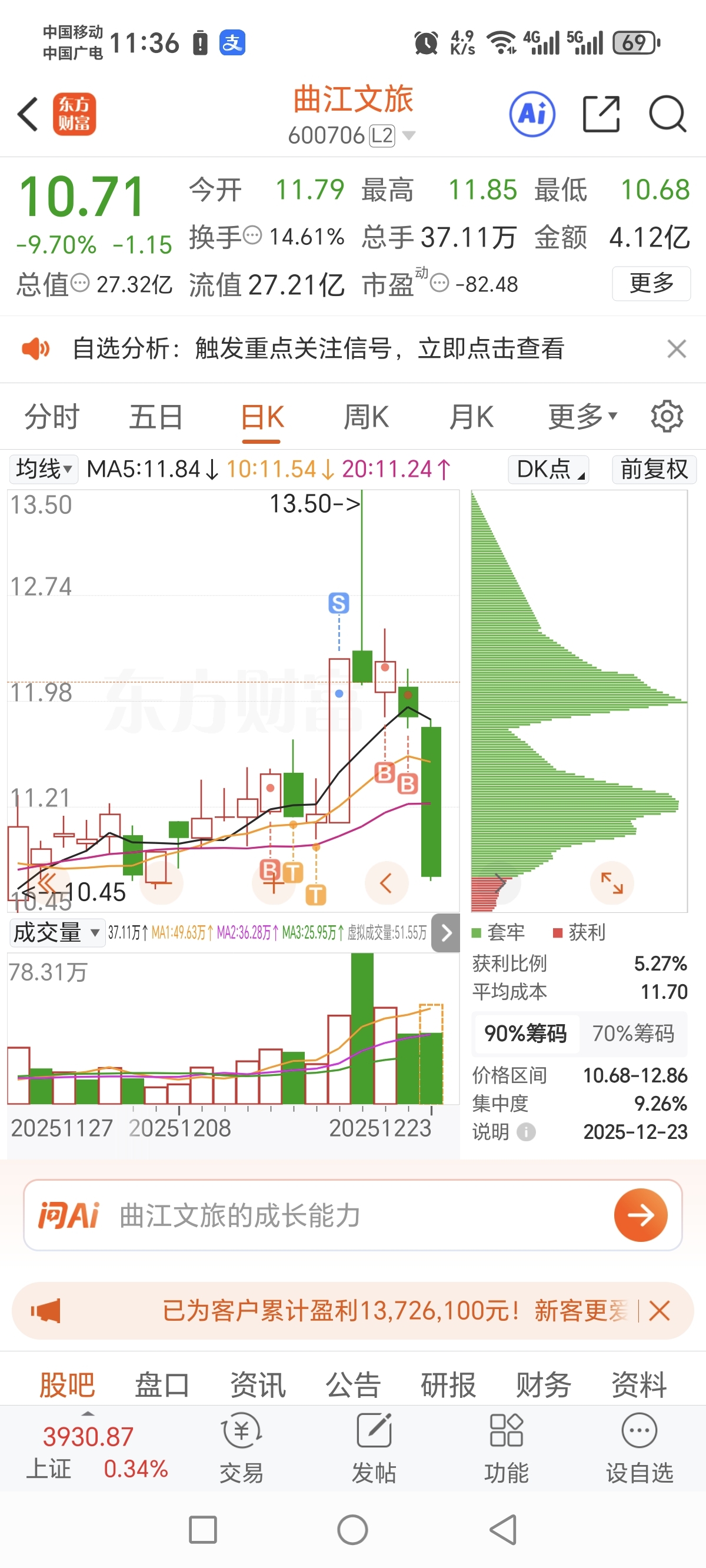 $曲江文旅(SH600706)$ 快一年没吃过跌停了,这个月利润今天一天快没了
