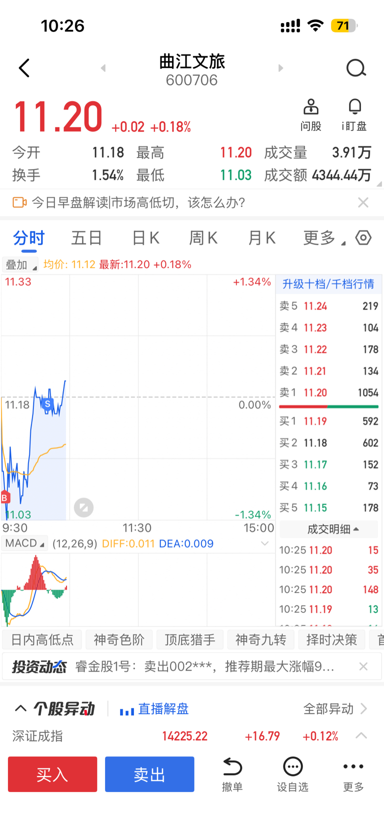 $曲江文旅(SH600706)$ 早上11.08买了一些,挂11.4,看冲不过11.2,11.18卖了,不会卖飞了吧