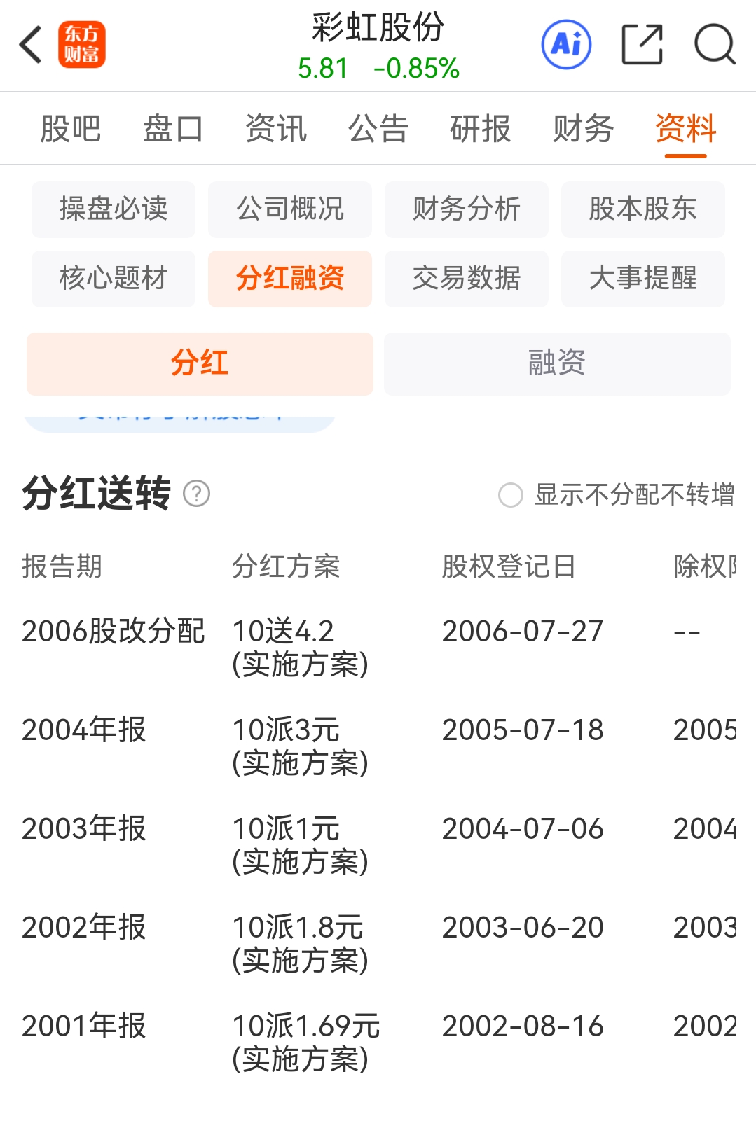 $彩虹股份(SH600707)$ 这家公司真是铁公鸡一毛不拔,近20年未分红,股价长期下跌投资者亏损累累,大股东咸阳金控2017年巨资入局,8年间浮亏超10亿,还不算期间的资金成本,国有资本严重流失,管理层是否尽责,这样的股票存在的意义?