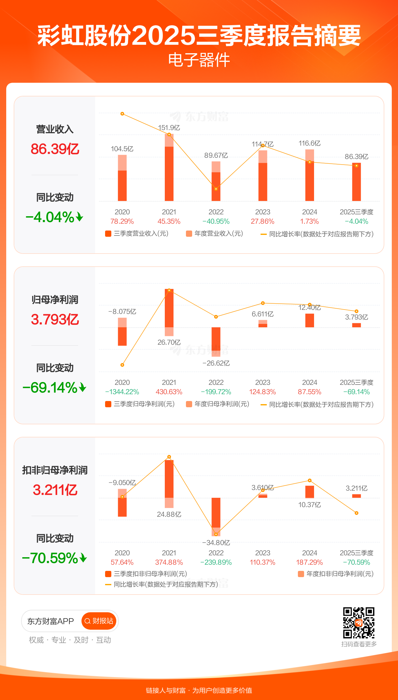 彩虹股份10月31日发布2025年三季报显示,公司前三季实现营业收入86.39亿元,同比下滑4.04%;归母净利润3.79亿元,同比下滑69.14%;扣非归母净利润3.21亿元,同比下滑70.59%。