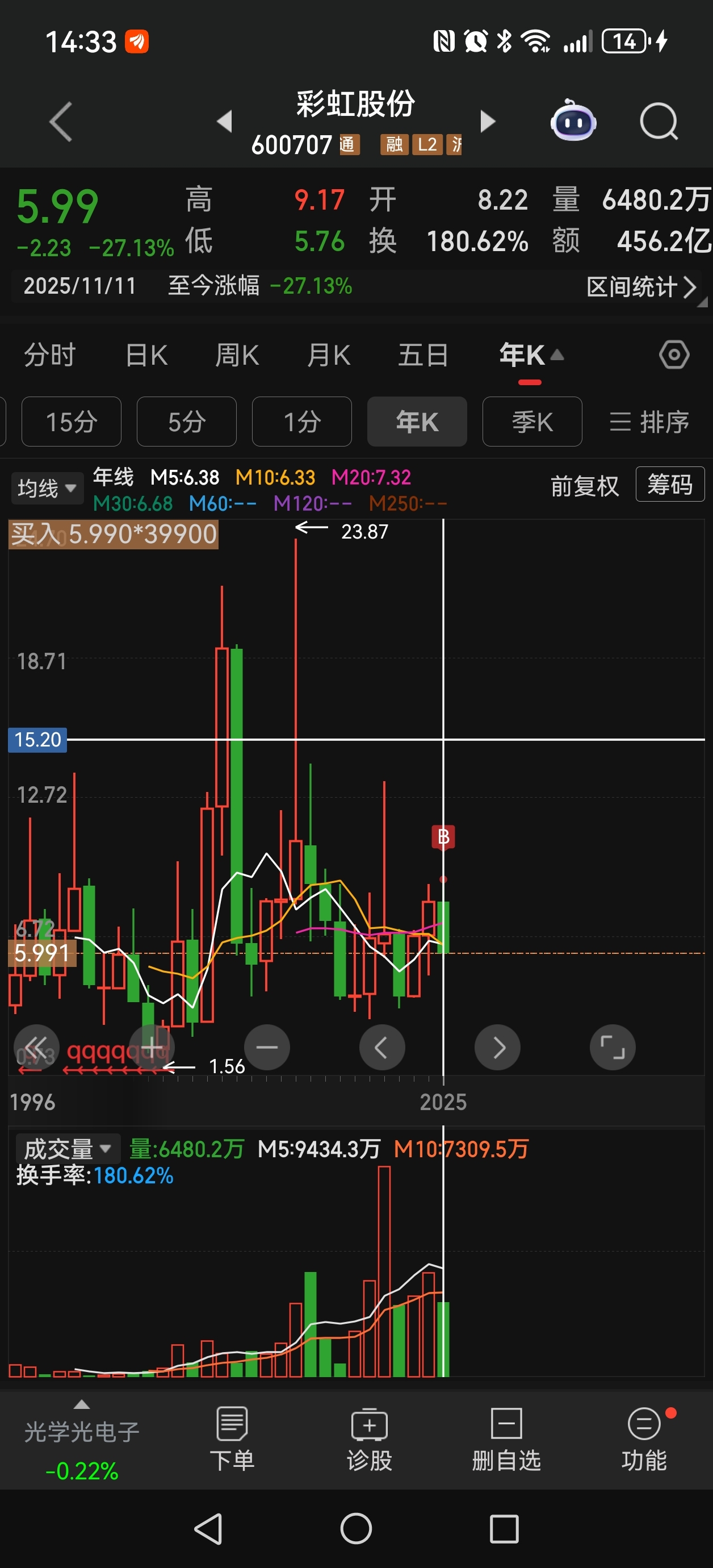 $彩虹股份(SH600707)$ 年线跌了27个点,我8.22买一直补仓到6.23算了跟你耗不起,走了。