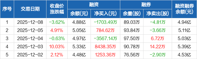 彩虹股份:融资净偿还1703.49万元,融资余额4.88亿元(12-08)