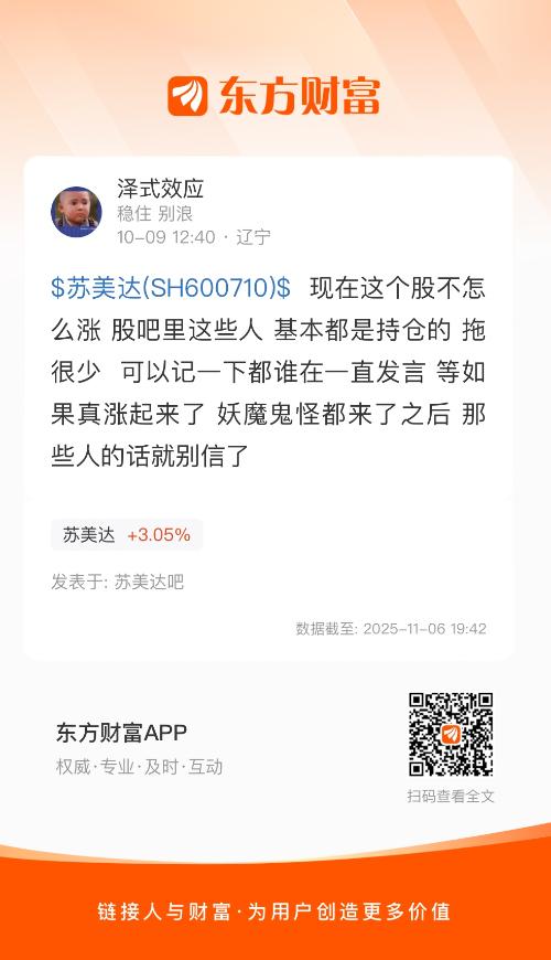 $苏美达(SH600710)$ 现在这个股不怎么涨 股吧里这些人 基本都是持仓的 拖很少 可以记一下都谁在一直发言 等如果真涨起来了 妖魔鬼怪都来了之后 那些人的话就别信了