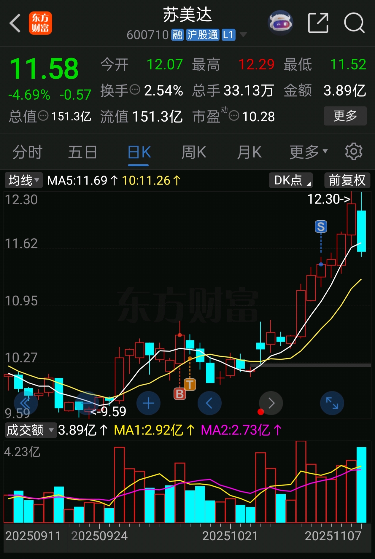 $苏美达(SH600710)$ 红了几天,涨的乏力,就先出了,大涨后也不敢接,果然又下来了