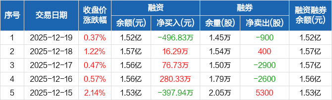 融资方面,当日融资买入528.67万元,融资偿还1025.49万元,融资净偿还496.83万元。融券方面,融券卖出0股,融券偿还900股,融券余量1.45万股,融券余额15.66万元。融资融券余额合计1.52亿元。