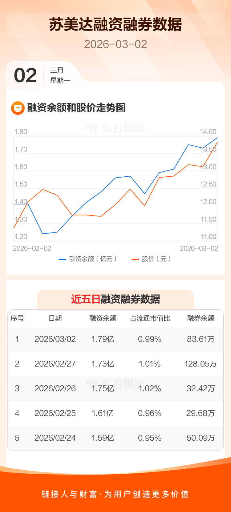 交易所最新数据显示,苏美达于2026年3月2日获融资买入5042.53万元,融资偿还4503.12万元,当日融资净买入539.4万元。目前,该股融资余额1.79亿,占流通市值比例为0.99%。