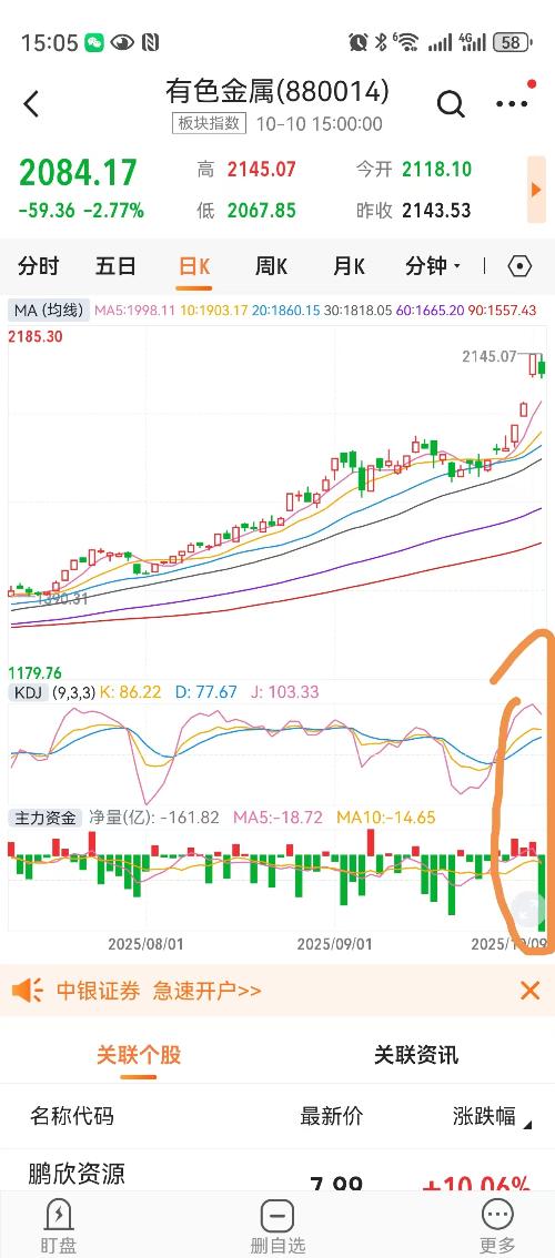 今天有色处于高位放量下跌,预测接下来会调整一段时间,长期上涨的逻辑还未变。今天个