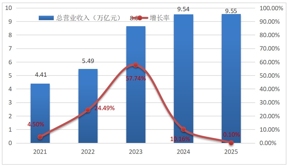 一是企业总营业收入基本持平。统计结果显示,2025年500强企业的总营业收入规模为9.55万亿元人民币(见图1),仅比上年度的9.54万亿元增加0.01万亿元,增长0.10%,增幅比上年度的10.16%减少10.06个百分点。