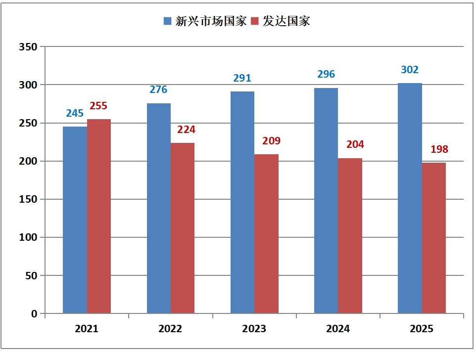 三是企业数上,2025年500强企业中,新兴市场国家企业为302家(见图3),比上年的296家增加6家;而发达国家企业为198家,比上年的204家减少6家。企业数上,新兴市场国家优势进一步扩大。