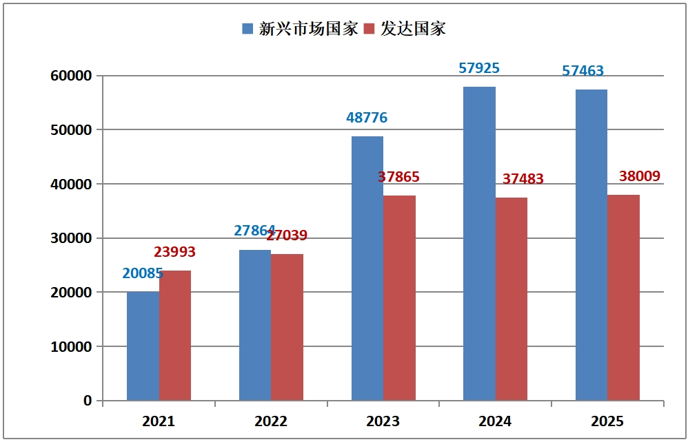 四是企业总营业收入上,2025年500强企业中,新兴市场国家企业的总营业收入为5.75万亿元(见图4),比上年的5.79万亿元小幅减少0.05万亿元;发达国家企业的总营业收入则为3.80万亿元,比上年的3.75万亿元小幅增加0.05万亿元,二者差距小幅收窄。(说明:文中因四舍五入的原因,数据会有所差异。)
